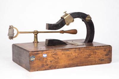 Su una solida base in legno è collocata verticalmente una calamita a ferro di cavallo che si mantiene in posizione in quanto parzialmente incastrata nella struttura di base. Sul ramo libero della calamita è presente un morsetto scorrevole, in ottone, che può essere fissato in un determinato punto per mezzo di una piccola vite.