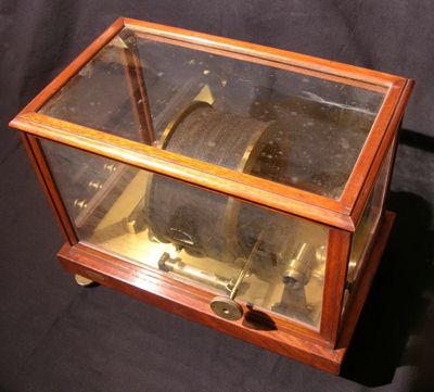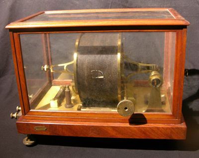 Bellissimo strumento di misura elettrico poggiante su una base in legno e protetto da una struttura realizzata in vetro e legno.