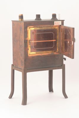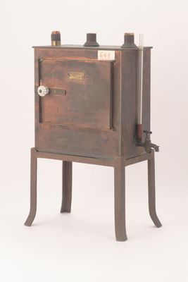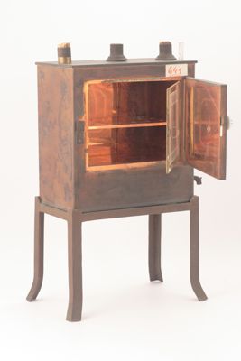 Scatola in rame poggiante su un basamento a quattro gambe. Sulla parete frontale è presente uno sportello apribile con pomello in ceramica. aperto lo sportello ne è presente un altro in vetro trasparente. All'interno si ha un vano con un ripiano forato in rame. Esternamente, su un lato, è fissato un rubinetto in metallo sovrastato da un tubo trasparente posto in verticale.