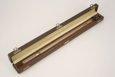 Il termometro è contenuto in un astuccio in legno ricoperto in pelle, con imbottitura interna.