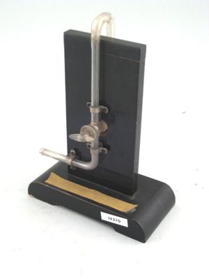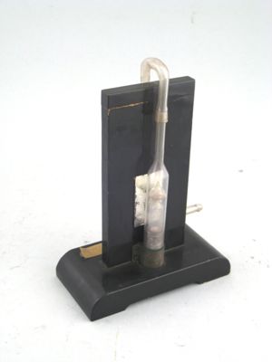 Vacuometro fissato su una struttura in legno. E' costituito da un tubo in vetro aperto ad un'estremità con un rubinetto anch'esso in vetro. Il tubo gira, dall'alto, attorno al sostegno in legno. Nell'estremità del tubo è inserito un altro tubo in vetro più largo nella parte bassa fissata alla base. All'interno di questa parte è inserita un'ampolla in vetro contenente mercurio.