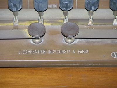Ponte di Wheatstone. E' in pratica una scatola di resistenze campione di tipica concezione ottocentesca. E' formata da una scatola in legno di forma rettangolare parallelepipeda poggiante su quattro piedini e chiusa in alto da una base in bachelite. Sulla parte superiore sono posizionati i tracciati conduttori - realizzati per mezzo di sbarrette in ottone - sui quali sono ricavate le sedi utilizzate per impostare i valori desiderati. Questa operazione veniva compiuta con l'ausilio di piccole spine metalliche (con manopola isolante) opportunamente posizionate. Sono, inoltre, presenti otto morsetti in ottone per i collegamenti elettrici e due interruttori a leva elastica.