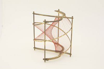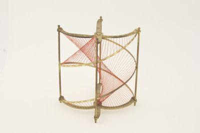Un filo di nylon rosso intelaiato su un castello in ottone raffigura lo sviluppo della superficie che il modello vuole rappresentare. Si tratta di una superficie generata dal movimento elicoidale uniforme (superficie elicoidale o elicoide) di una retta (da qui "rigato") che non incontra l'asse dell'elicoide (quindi "aperto"), e che non è perpendicolare a detto asse (cioè è "obliquo").