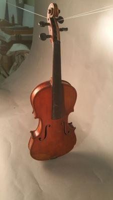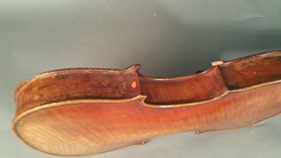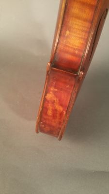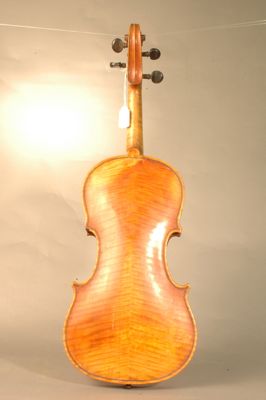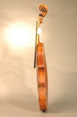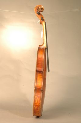 Strumento su modello Stradivari. La tavola armonica è in due pezzi di abete. Il fondo è in due pezzi di acero marezzato. La tastiera e i piroli sono in ebano. I piroli non sono temperati ma lavorati a coltello. La vernice è probabilmente a olio. Il lavoro è pulito e ben curato.