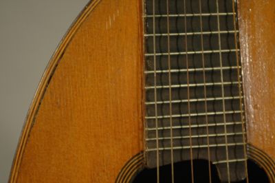 Mandolino lombardo a sei corde singole. Il guscio, formato da quindici doghe probabilmente in cipresso inframmezzate da filetti in acero, ha la tipica forma lombarda a mezzo uovo. Tra le giunte delle doghe è presente della carta di colore chiaro. Nella calotta, decorata con filetto, sono incise, nella parte centrale, le lettere M G . Sul cavigliere a falcetto, già riparato, è presente una placca quadrata intarsiata in osso o avorio e, ai lati, cinque filetti in legno probabilmente in acero ed ebano. Due dei sei piroli presenti sono diversi dagli altri. La tastiera, probabilmente in ebano, continua sopra la buca e ha venti tasti metallici intervallati da scanalature concave. La buca, di forma ovale, e' circondata da otto filetti in legno probabilmente in acero ed ebano. Il ponticello, probabilmente in ebano, è fisso e con baffi discendenti. Il battipenna è in legno. Nella parte inferiore della tavola armonica è presente una decorazione in ebano con intarsiata una stella a otto punte in madreperla. La vernice è probabilmente gommalacca. All'interno della cassa armonica sono posizionate tre catene, una superiore e due inferiori, e due rinforzi laterali alla buca.
