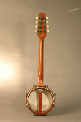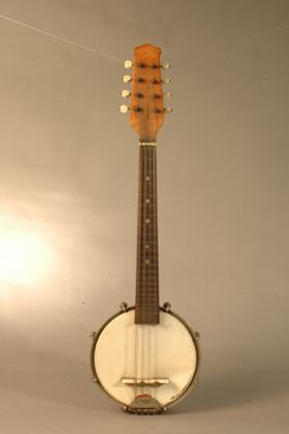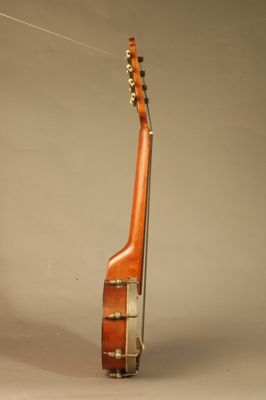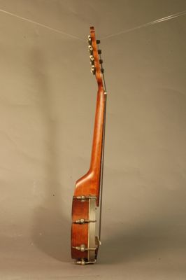 Banjo di piccole dimensioni. La cassa armonica a forma di corona circolare è in mogano con base coprifasce in palissandro. Alla cassa è fissato con otto tiranti metallici un anello di risonanza su cui è tesa la pelle con funzione di tavola armonica. Il ponticello è, probabilmente, in noce. Il capotasto superiore e quello inferiore sono in osso. Il copricorde è metallico. Il manico passante è in mogano. La tastiera è in palissandro con ventuno tasti in ottone e segnatasti nel terzo, quinto, decimo e dodicesimo tasto. Le otto meccaniche sono in ottone con pallini in osso.