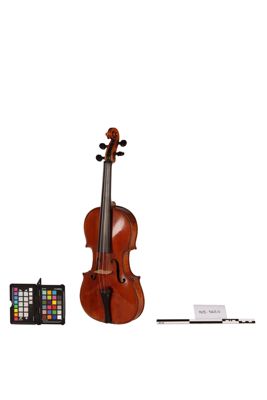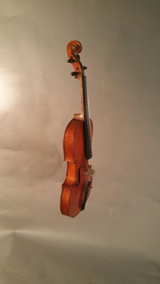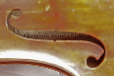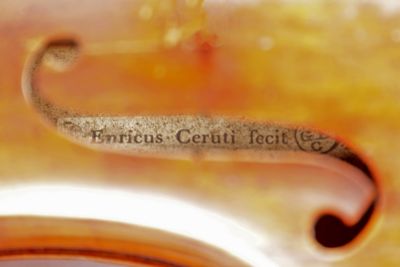 Lo strumento è opera del liutaio cremonese Enrico Ceruti, ultimo grande esponente di questa famiglia di liutai, eredi della tradizione stradivariana. Fu venduto nel 1961, per 300.000 lire, dal musicologo e incisore Benvenuto Disertori, che stava curando per il museo il progetto museologico della nuova sezione di stumenti musicali. Fu il primo strumento acquistato per la collezione del museo, grazie alla donazione della cantante Emma Vecla, nome d'arte di Ernestina Telmat (1877-1972), prima interprete in Italia della Vedova Allegra di Lehar.
