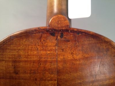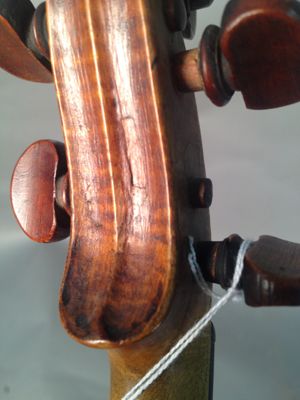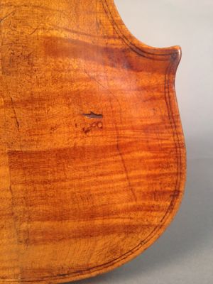 La tavola armonica è in due pezzi a specchio di abete con due fori armonici a forma di "effe". Il filetto nella tavola è in acero ed ebano. Il fondo è in due pezzi di acero marezzato. Il filetto nel fondo è solamente disegnato. Le fasce sono in acero marezzato. Il manico e la testa sono innestati e in acero. I fori originali del riccio sono stati chiusi e rialesati. La chiocciola è staccata dal riccio. i Piroli, originali, e il bottone sono in palissandro. La tastiera, non originale, è in ebano. Il ponticello, marcato Dresden, è in acero. La vernice è di colore giallo bruno. Mancano gli zocchetti all'interno della cassa armonica in corrispondenza delle "C". Mancano le controfasce eccetto nella parte superiore per rinforzare l'incastro. Strumento presumibilmente di fascia economica bassa.