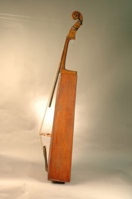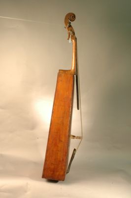 La tavola armonica, con fori armonici a forma di effe, è in due pezzi di abete con bombatura tipica degli strumenti ad arco. Il filetto nella tavola è in legno chiaro e tinto. Il fondo, probabilmente più recente, è in due pezzi forse in noce. Le fasce e il manico, collegato alla cassa armonica con un incastro a coda di rondine, sono probabilmente in acero. la vernice è di colore rosso bruno. Nella testa a riccio con cassa a quattro piroli, sono presenti delle scanalature laterali. La tastiera è in legno tinto di nero con punzonature a forma di asterisco su tutto il perimetro. Sotto la tastiera è presente una zeppa in legno aggiunta successivamente. La cordiera è in legno tinto di nero e il reggicordiera è in ottone. Il bottone è probabilmente in legno da frutto. Il pirolo della corda sol ha forma differente rispetto agli altri tre. All'interno della cassa armonica sono presenti dei rinforzi in legno sulle fasce e sul fondo e una catena longitudinale sulla tavola.