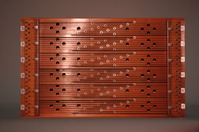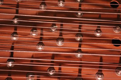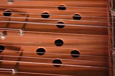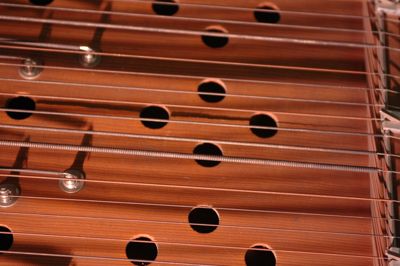 Salterio ad accordi a ottantaquattro corde con nome indicato da etichette metalliche. Nella tavola, in abete, sono presenti sessanta fori armonici distribuiti simmetricamente. Il fondo e le fasce sono in acero. La cavigliera è in faggio.