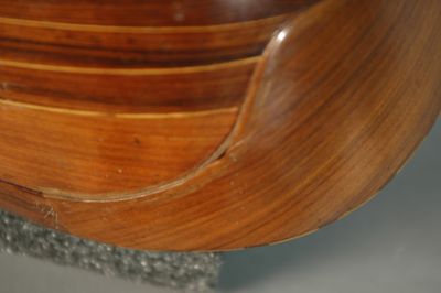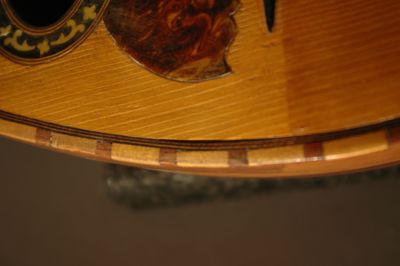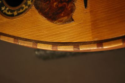 Mandolino napoletano a quattro ordini con manico a V alla romana. La tavola armonica è in abete. Il guscio è formato da diciannove doghe in palissandro inframezzate da filetti in acero ed è verniciato probabilmente in gommalacca. I due filetti della tavola armonica sono in palissandro e acero contornati da un ulteriore filetto esterno a poligoni sempre in palissandro e acero. La buca ovale è circondata da un intarsio in ebano e madreperla posto tra due filetti in acero e palissandro. Sotto la buca è posizionato un parapenna in tartaruga. Il ponte mobile posto appena sopra la piega è in ebano e osso. La tastiera è in palissandro con segnatasti intarsiati in madreperla. L'incastro del manico è all'altezza del decimo tasto. I tasti sono metallici, probabilmente in ottone. La cordiera è in lega metallica. Le meccaniche hanno le palette in osso. All'interno del guscio sono posizionate tre catene e due rinforzi laterali