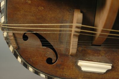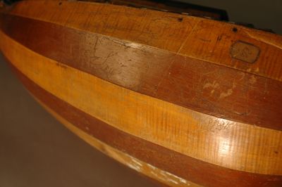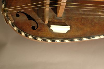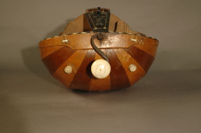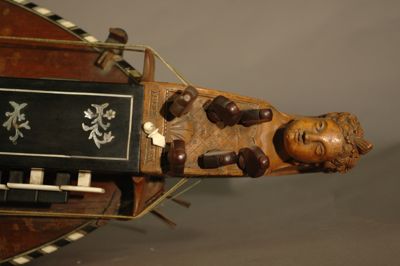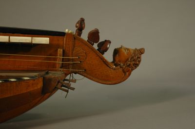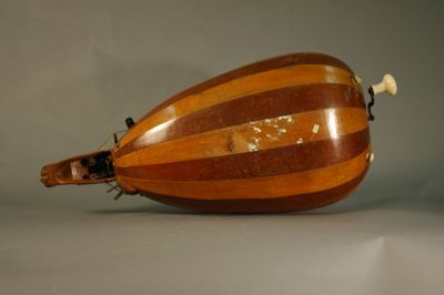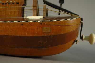 Ghironda francese del 1750 costruita durante il periodo di massima espansione dello strumento. Sono presenti due cantini tastabili accordati in quinta, cinque corde di bordone variamente accordabili in base ai brani da suonare e quattro corde simpatiche, non originali, in metallo. Nella tavola armonica, leggermente bombata, sono presenti due fori armonici a forma di "C" a fianco della cordiera più altri fori armonici posti sotto il castelletto. Il castelletto è in acero marezzato con decorazioni a punzone nelle pareti. Il coperchio del castelletto, il coperchio della ruota e la cordiera sono impiallaciati in ebano e intarsiati in madreperla. Il copriruota è fermato da due bloccchetti in avorio posizionati sulla tavola armonica. Il filetto a losanghe bianche e nere sulla tavola è realizzato con parti in avorio o osso alternate con altre in ebano. Il guscio è a nove doghe in acero e palissandro. La vernice trasparente a base di gommalacca è di colore giallo. Il cavigliere a falcetto in bosso è decorato a punzone nei fianchi e intagliato con conchiglie e una testa di donna. I sei piroli in palissandro sono sagittali al cavigliere e non laterali come nel violino. La tastiera ha ventitré tasti: tredici diatonici in avorio e dieci cromatici in ebano. La manovella è in ferro con pomelli in avorio. All'interno della cassa armonica sono posizionate tre catene sulla tavola: una sotto il ponticello prima della ruota e due oltre la ruota. Come rinforzo del guscio sono posizionate sottili strisce in abete sia in direzione delle giunte delle doghe sia trasversali a queste.