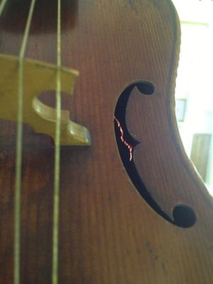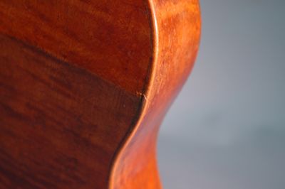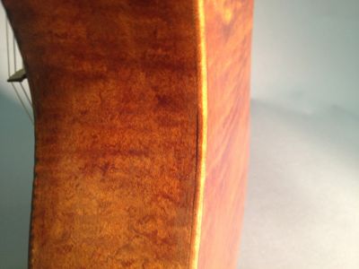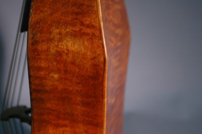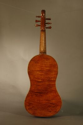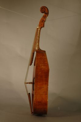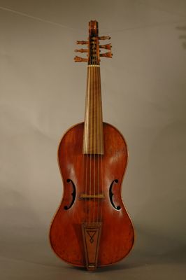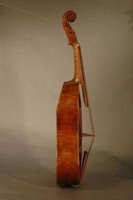 Viola da gamba soprano a sei corde con cassa armonica a forma di otto. Lo strumento riproduce fedelmente uno strumento originale rinascimentale di Juan Maria di Brescia. La tavola armonica, scavata, è in abete con fori armonici a forma di "C". Il fondo, piatto, è in acero ed è piegato nel primo terzo superiore. Il filetto sia nella tavola sia nel fondo è probabilmente in acero ed ebano. Le fasce sono in acero con la giunta nell'area del bottone in lastra di legno tinto nero. La vernice è ad alcool di colore giallo bruno. Il manico è in acero con tastiera in acero tinto a imitazione del bosso senza tasti a legacci. La cordiera è in acero tinto a imitazione del bosso con decorazione geometrica in stucco di ebano. Il ponticello, in acero, è posizionato a metà della "C". Il capotasto è in osso mentre quello inferiore è probabilmente in corno ( "ambra" secondo la scheda originale). All'interno della cassa armonica sono posizionate due catene orizzontali (rispettivamente nella parte superiore e inferiore del fondo) oltre a una catena verticale nel lato sinistro della tavola armonica e un rinforzo orizzontale per l'anima nell'area centrale.
