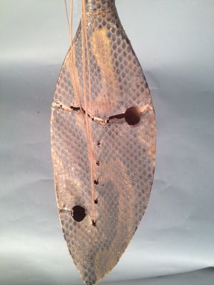 Nanga originale di origine congolese in serpente e avorio. La cassa armonica a semiguscio oblungo è in cocco ed è ricoperta da una pelle di pitone in cui sono ricavati due fori armonici tondi, uno in alto a destra e uno in basso a sinistra. La funzione di tavola armonica è svolta dalla stessa pelle di pitone che ricopre il guscio. Nel manico in avorio, scolpito all'estremità con una figura di testa femminile, sono inseriti, a sinistra, cinque piroli torniti in avorio. Le corde, in fibra vegetale, sono ancorate su un supporto longitudinale.