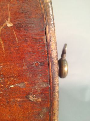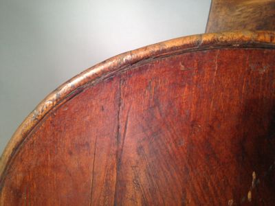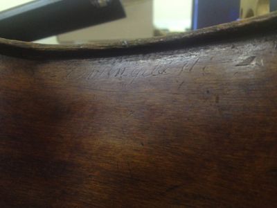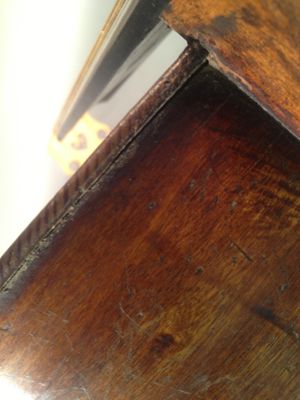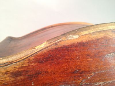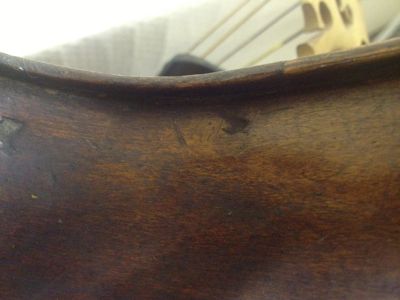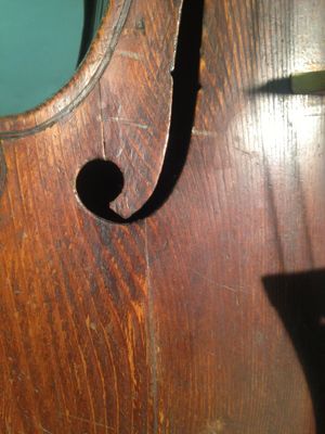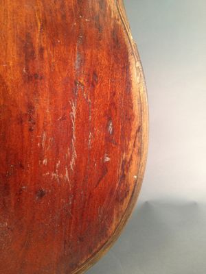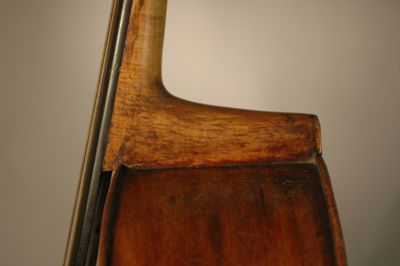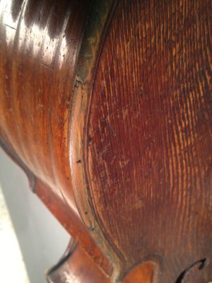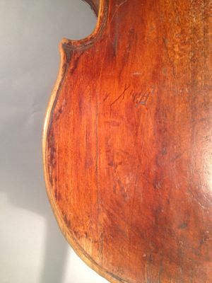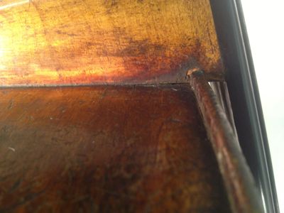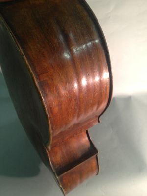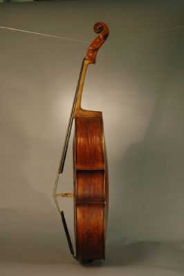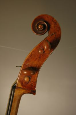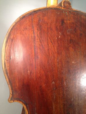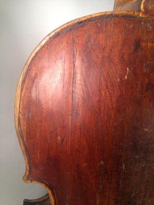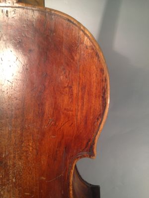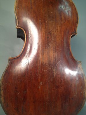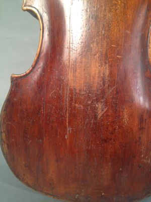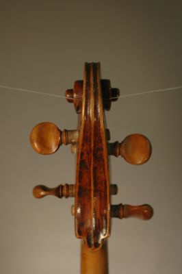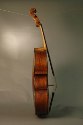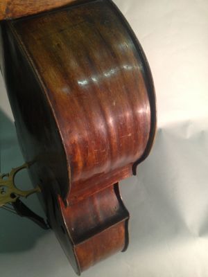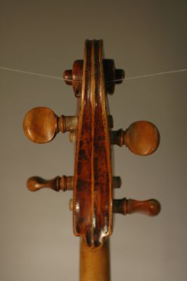 Violoncello di taglia 1/2. La tavola armonica è in due pezzi di abete con un pezzo aggiunto nel bordo superiore destro. Il fondo è in due pezzi di acero tangenziale. Il filetto, sia nella tavola sia nel fondo, è in acero e legno tinto, probabilmente acero. Nelle fasce in acero è presente l'iscrizione "Evangelisti" sul lato sinistro (graffiata sulla vernice) e un'altra, non leggibile, sul lato destro. Il manico è innestato e fissato con due viti allo zocchetto interno alla cassa. La testa, in acero, è a riccio con quattro piroli in bosso. La tastiera, il capotasto e la cordiera con filo metallico sono in ebano. Il bottone è in bosso con rivestimento metallico. Il ponticello non sembra originale. La vernice, ad alcool, è di colore bruno. Le corde sono in budello (la, re) e in budello rivestito (sol, do). All'interno della cassa armonica è posizionata una catena classica sul lato sinistro della tavola. Mancano l'anima e il puntale.