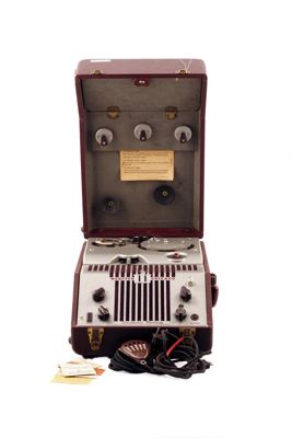 MODEL 180-1 -- RMA 375 / WEBSTER-CHICAGO / WIRE RECORDER / THIS UNIT LICENSED UNDER ARMOUR / RESEARCH FOUNDATION PATENTS / SERIAL NO. 117567 / OPERATE ONLY ON A.C. CURRENT AT: / 105-120 VOLTS 60 CYCLES 55 WATTS / CHICAGO 39, ILL. U.S.A. (documentaria)