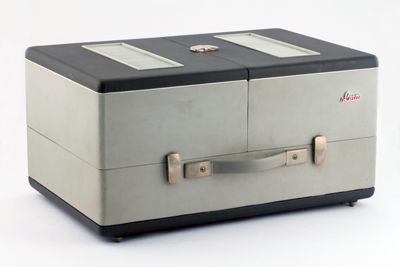Fonovaligia con struttura in legno, rivestita di tela grigia scura sul fondo e sulla sommità e chiara della fascia centrale. Il coperchio della valigia è costituito dalle due casse asportabili. Una volta aperto, sul piano si trova il piatto in plastica grigia chiara, con in braccio in plastica dello stesso colore; tra il braccio e il piatto si trova la manopola per la selezione della velocità del disco (16, 33, 45, 78 giri). Sul lato sinistro del piano si trovano il commutatore della tensione di alimentazione, una presa per il collegamento ad un registratore a nastro e i comandi operativi, costituiti da quattro selettori a manopola (loudness/accensione, tremble, bass, balance); una spia luminosa indica l'accensione dell'apparecchio. Davanti ad ogni cassa è posta una boccola per il collegamento della cassa. Ogni cassa contiene un altoparlante e presenta una mascherina in plastica bianca su entrambi i lati. Il cavo elettrico per l'alimentazione della fonovaligia dal lato posteriore. Sul fondo si trovano delle prese d'aria coperte da una retina traforata in metallo.