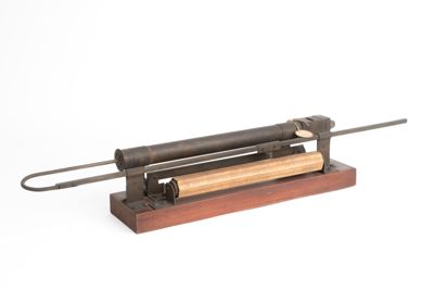 tubo in ottone provvisto di uno stantuffo, ad una estremità, e una imboccatura in legno tornito all'estremità opposta. Lo stantuffo viene mosso dall'aria immessa attraverso l'ausilio di un mantice a pedale (non presente). Ad ogni movimento dello stantuffo corrisponde un valore segnato su un cilindro mobile graduato (scale segnate su carta), indicato da un cursore collegato allo stantuffo. Il tubo e il cilindro sono fissati su una base in legno di forma rettangolare.