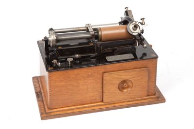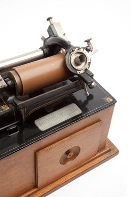 Il fonografo è costituito da una base in legno, all'interno della quale è situato il motore a molla, e da un piano superiore in ghisa, dove si trovano il mandrino e la testina di riproduzione. La base è provvista di un cassetto sul lato anteriore. Il piano superiore è sollevabile per accedere direttamente al motore a molla, azionato dalla manovella posta sul fianco destro dell'apparecchio. Il motore mette in rotazione il volano posto sul lato sinistro del piano; nel volano è innestata una vite senza fine proseguente nell'asse su cui è fissato il mandrino. La vite senza fine, ruotando, spinge il supporto della testina lungo la guida parallela al mandrino. ll supporto destro del mandrino è serrato con una chiusura a chiavistello ed è apribile per l'inserimento del cilindro. Nella parte anteriore del piano è situata una manopola in metallo per la regolazione della velocità di rotazione e una leva. Il fonografo è accessoriato con un tubo rivestito di tessuto e terminante con un imbuto in ebanite per l'ascolto dell'incisione.