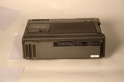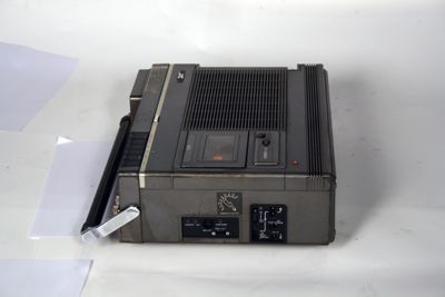 Dispositivo che racchiude un televisore e un radioregistratore. La scocca del dispositivo è in plastica grigia con maniglia per il trasporto utilizzata anche come piedistallo per posizionare in maniera inclinata l'apparecchio e facilitarne l'uso.