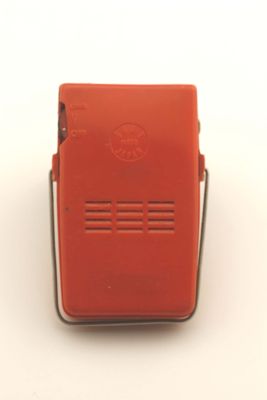Apparecchio con scocca in plastica color rosso a forma rettangolare. Al centro della parete frontale una griglia in metallo anodizzato, fissata con una flangia circolare color oro, protegge l'altoparlante. E' presente una staffa metallica estraibile per il trasporto e il posizionamento verticale su un piano.