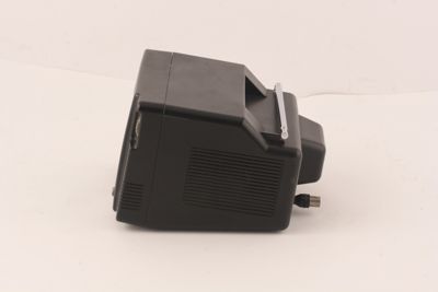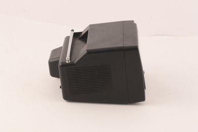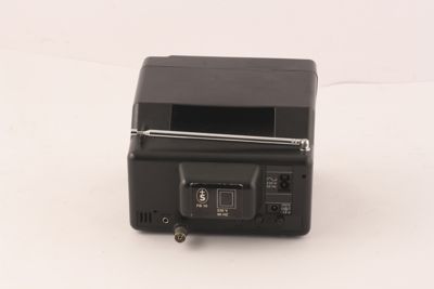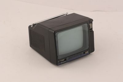 Piccolo televisore portatile in materiale plastico nero, con schermo 5 pollici protetto da una lastra in plastica trasparente.