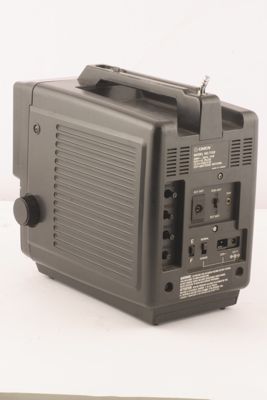 Apparecchio in materiale plastico nero dalla forma stretta e profonda. Nella parte superiore si ha una maniglia per il trasporto sulla quale si trova un'antenna estraibile orientabile.