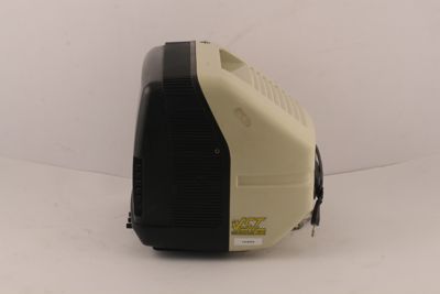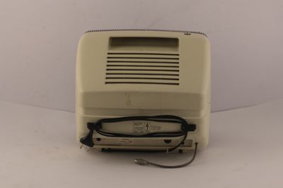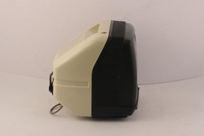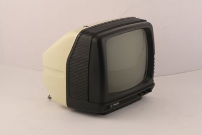 Apparecchio in materiale plastico nero nella parte anteriore e bianco in quella posteriore, con profili arrotondati e smussati. La parete frontale è occupata dallo schermo del cinescopio da 12 pollici autoprotetto.