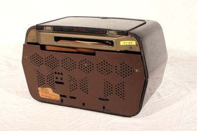 Radiofonografo da tavolo in legno. La parete frontale, in plastica bianca con profili dorati, è occupata dall'altoparlante protetto da una griglia in tessuto e dai comandi.