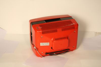 Apparecchio in materiale plastico rosso con profili arrotondati e una fascia nera posta trasversalmente. Nella parte superiore si ha una maniglia estraibile per il trasporto e due antenne incorporate a stilo.
