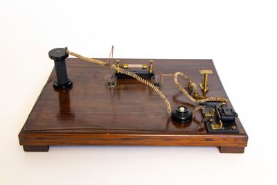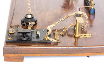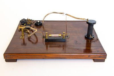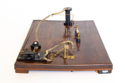 tavola su cui è fissato un circuito composto da un tubo in vetro contenete della limatura metallica (ricevitore onde) dotato di manovella per la rotazione lungo l'asse orizzontale, un rocchetto, una elettrocalamita e un galvanometro. Il tubo a limatura è collegato al rocchetto e al galvanometro tramite due fili di rame di grosso diametro, i quali si immergono in due bicchierini di vetro contenenti mercurio (metallo non presente). Il rocchetto e l'elettrocalamita sono collegati in due modi: direttamente e attraverso un un interruttore a pulsante. Un secondo interruttore, a martello, è posto tra l'elettrocalamita e il galvanometro.