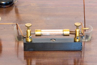 replica del circuito con tubo a limatura metallica (precursore del coherer) di Calzecchi Onesti, utilizzato durante la seconda esperienza. Questa copia fu fatta realizzare dal CNR in occasione dell'Esposizione Universale di Chicago del 1933, "A Century of Progress", che intendeva celebrare il progresso scientifico e tecnologico.