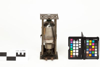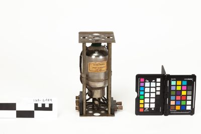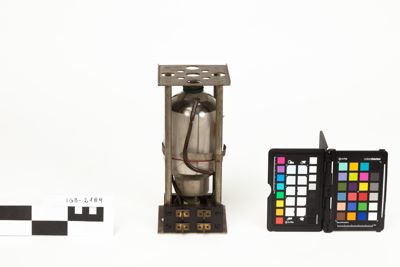 E' composto da una tubo in vetro mantenuto sotto vuoto al cui interno vi sono tre elettrodi (griglia, filamento e placca). Il tubo è inserito in un castello di alluminio (?) che serve da protezione da urti e permette un facile inserimento nei circuiti dell'apparato di trasmissione radio.