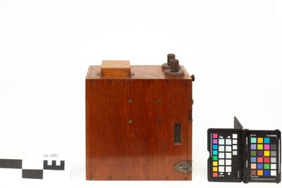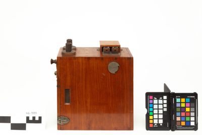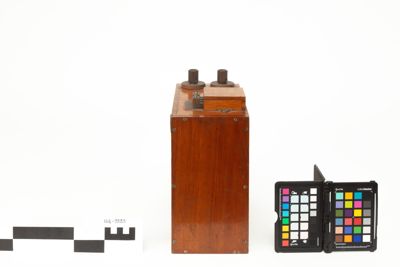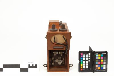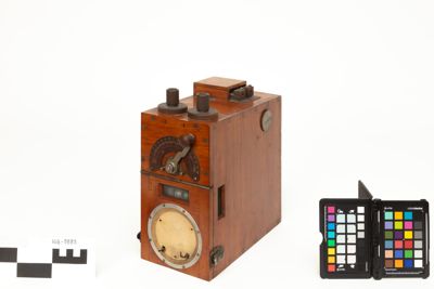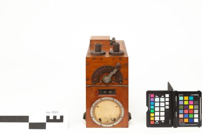 E' una scatola in legno contenente un rocchetto di induzione e un oscillatore a scarica per la generazione delle oscillazioni elettriche a radiofrequenza. All'esterno della scatola sono presenti diverse manopole e collegamenti per dispositivi esterni: sul lato superiore ci sono le prese di terra e d'antenna e i serrafili per il tasto telegrafico; sul pannello frontale si trova una leva che si muove su di una scala graduata, inoltre la parte bassa del pannello frontale, ospitante un amperomentro (mancante), è apribile per consentire l'ispezione rapida dei circuiti interni e in particolare dello scaricatore.