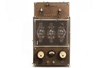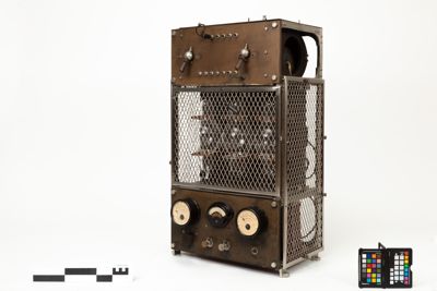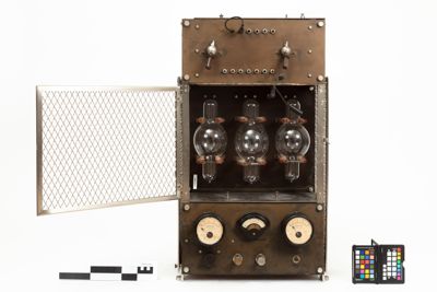 Il manufatto ha forma parallelepipeda con aperture su tutti i lati. La struttura, simile ad uno scaffale, presenta frontalmente tre quadri isolanti in ebanite, dei quali quello al centro è posto più all'interno rispetto agli altri due e ospita tre valvole (due diodi ai lati e un triodo al centro) protette da ante a rete metallica. Sul quadro in alto sono poste, ai lati, due manopole in ebanite e ottone e, al centro, su due file, una sopra e una sotto rispetto alle manopole, rispettivamente, 5 e 7 borchie metalliche. Escono da ulteriori due borchie, in ebanite, rispettivamente a sinistra della fila in alto e a destra di quella in basso, due cavi muniti di jack. Sul quadro in basso, sono fissati tre strumenti di misura, due amperometri identici, tondi da pannello con scala 0-10 A, ai lati, e un milliamperometro, scala 0-300 mA, al centro. Poco sotto, sempre sullo stesso quadro, da sinistra verso destra, sono poste: una manopola in ebanite, due regolatori metallici a vite e una borchia con al centro un tasto in ebanite. Sui due lati del manufatto sono poste reti metalliche a protezione delle parti interne, tranne per la parte superiore che presenta i lati piatti una bobina cilindrica doppia con due traferri e a spire multiple. Il retro dello "scaffale" è aperto e rende possibile la vista dei componenti e dei collegamenti elettrici interni. In particolare, sono visibili: in basso da sinistra, una bobina cilindrica e, subito dietro, un condensatore in scatola lignea, due bobine con traferro stese sul lato lungo, un trasformatore e, centrale in alto, fissata sul retro del pannello frontale, un'ulteriore bobbina cilindrica; al centro il retro del pannello frontale che mostra i collegamenti tra le valvole; in alto la bobina cilindrica doppia con due traferri e a spire multiple di cui sopra.