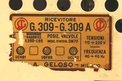RICEVITORE/ G.309-G.309 A/ RADDRIZZ./E250-C85/ POSIZIONE VALVOLE/ INDIC. SINTON. DM70/ UCH81/ UBF89/ UCL82/ ... A. GELOSO - MILANO/ TENSIONI/ 110/220 V/ FREQUENZA/ 40/60 hZ (documentaria/ funzionale)