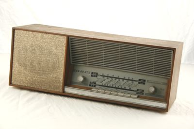 Sulla sinistra della parete frontale si trova l'altoparlante con una protezione in tessuto, sul lato destro si hanno una griglia in plastica grigia, la scala di sintonia e i comandi d'uso.