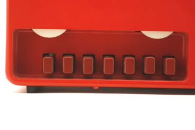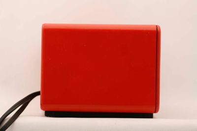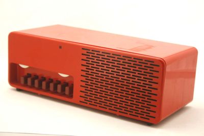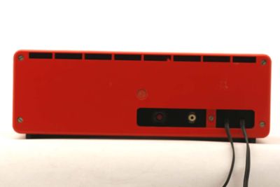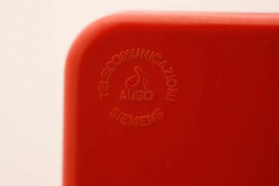 Apparecchio a forma di parallelepipedo materiale termoplastico antiurto color rosso opaco poggiante su strisce in gomma antiscivolo.