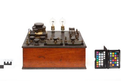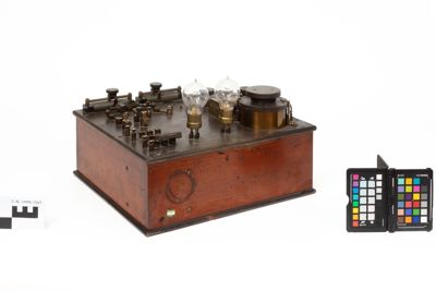 E' un ricevitore per Telegrafia Senza Fili (TSF) o radiotelefonia basato sulla rivelazione a cristallo di Carborundum e con amplificazione del segnale con valvole (triodi). L'oggetto è composto da una scatola in legno con parte superiore in ebanite. Sul lato superiore della scatola si trovano: due cristalli con sedi intercambiabili, un condensatore a scorrimento e uno a rotazione, due reostati, diversi serrafili e interuttori in ottone e le due valvole alloggiate nelle loro sedi con attacco alla francese.