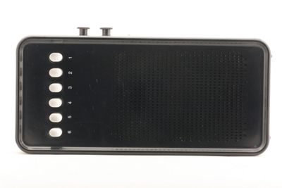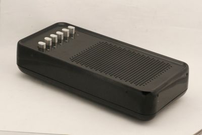 Apparecchio a forma di parallelepipedo in materiale plastico nero con piano superiore ribassato a forma di vaschetta. Realizzato in materiale termoplastico antiurto è costituito da due parti: la parte inferiore contiene i circuiti di funzionamento con elementi disposti in orizzontale per ottenere un oggetto allungato, quella superiore contiene i tasti di funzionamento e la griglia protettiva dell'altoparlante magnetodinamico. Il circuito interno comprende 1 diodo, 5 transistor e un raddrizzatore a ponte. Lateralmente si hanno due piccole manopole per la regolazione dei toni e del volume. L'apparecchio può essere sistemato anche in posizione verticale sia sul lato maggiore che minore. E' presente una presa per magnetofono e altoparlante esterno da 15 Ohm.