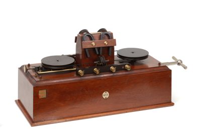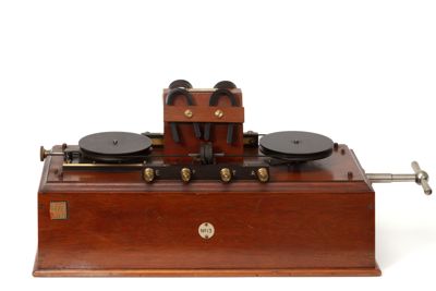 All'esterno della scatola due pulegge in ebanite - una collegata al motore e l'altra libera (in folle) - trascinano una trecciola in ferro dolce.
