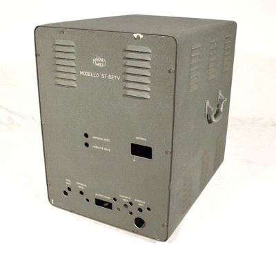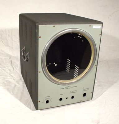 Televisore dalla forma che ricorda un oscilloscopio di grosse dimensioni. Scocca in metallo aerato sui lati e con maniglie. La parete frontale presenta un foro circolare nel quale si inserisce lo schermo del cinescopio. Il cinescopio è circolare da 10 pollici ed è montato in orizzontale, collegato ad un telaio in metallo sul quale è fissato anche il circuito a valvole.