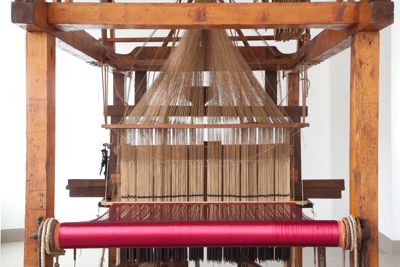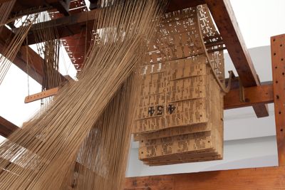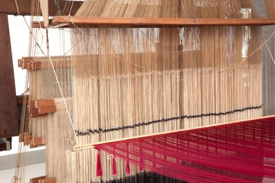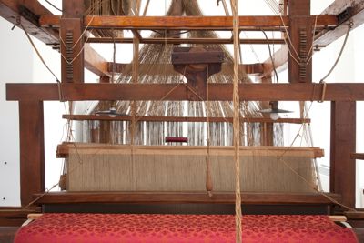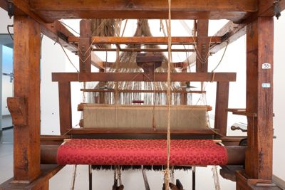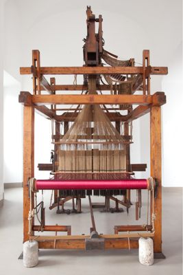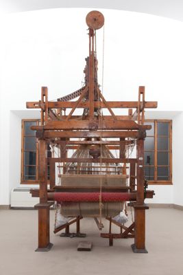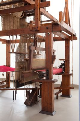 Telaio in legno a mano (Categoria ML, Matricola 2, Costruttore S.A. Schmid) con cassa battente a una navetta, una ratière, una macchina tipo "Jacquard" in legno con cilindro a quattro fasce con fori tipo "Vincenzi", 320 arpini (da 308-320), 16 licci. Completo di cartoni per tessuto operato.
