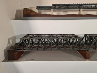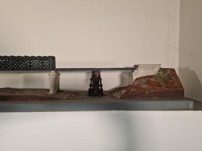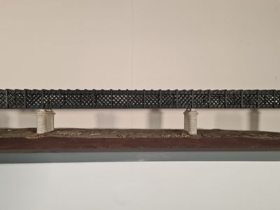 Plastico ferroviario in scala 1:100 di ponte in ferro danneggiato.