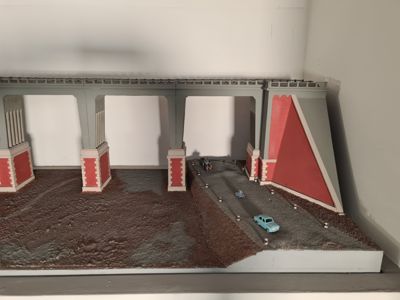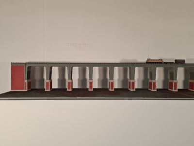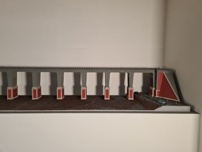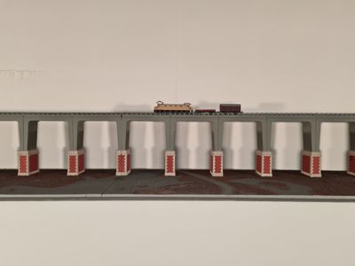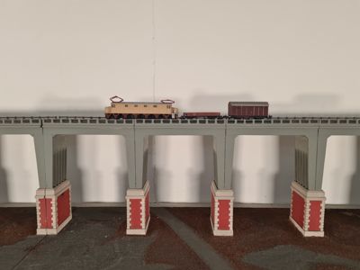 Plastico del viadotto di Desenzano sul Garda, con modelli di locomotiva e vagoni.