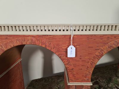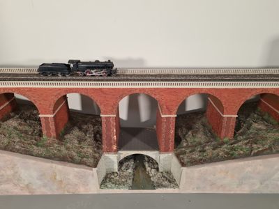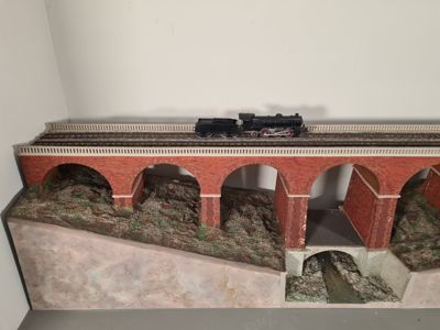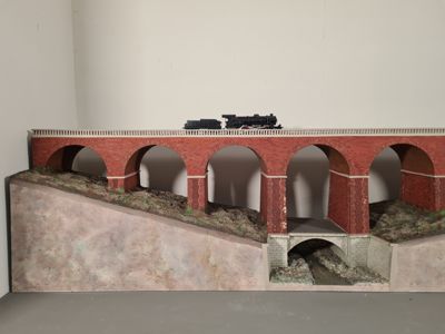 Plastico di ponte ferroviario a 7 arcate, con modello di locomotiva e tender.