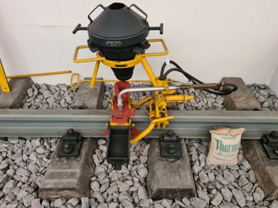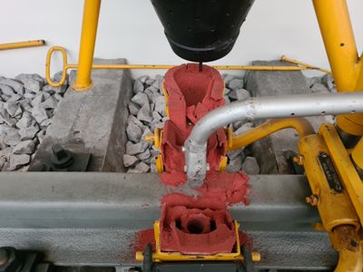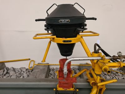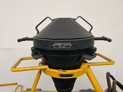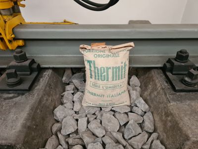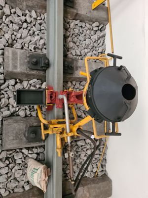 Crogiuolo completo di fodera, tappi di magnesite, punta con coperchio, porta crogiuolo, pozzetto di colata in refrattario, un paio di forme, cannello di preriscaldamento, morsetto universale, raccoglitore di scorie, calibro per morsetto universale e luca rotaia, 2 aste 1 pestello, 1 sacchetto porzione, spezzone di rotaia fissata su 4 blocchi di cemento.