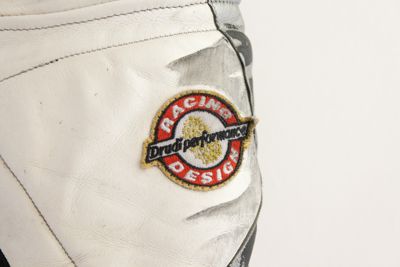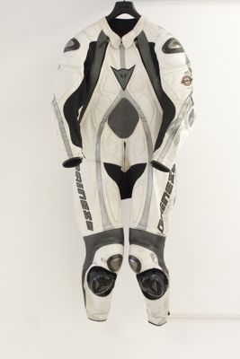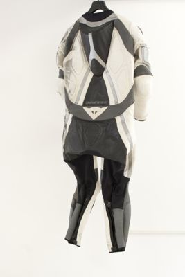 Questa tuta è stata studiata da Aldo Drudi per la Dainese e riesce a coniugare la migliore posizione di guida, il massimo confort e sicurezza del pilota.