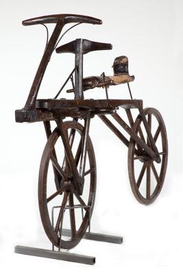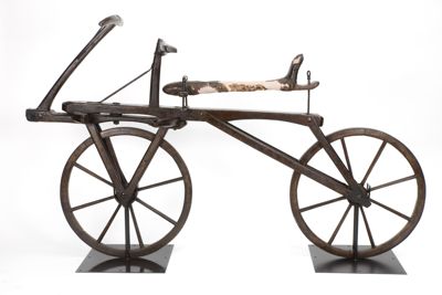 Velocipede costituito da una traversa orizzontale in legno, sostenente la ruota posteriore attraverso due bracci triangolari in legno; La ruota anteriore è sorretta da una forcella, solidale al manubrio, anch'esso in legno. Il complesso formato da manubrio, forcella e ruota anteriore è imperniato nella parte anteriore della traversa, costituendo il sistema di sterzo. La sella è montata su una barra separata, rialzata dalla traversa portante per mezzo di tre chiavi regolabili; la due chiavi anteriori sono fissate a due piccole barre laterali, poste accanto alla parte frontale della sella. La sella è costituita da un sedile imbottito rivestito di pelle, con la parte posteriore inclinata verso l'alto. Sulla traversa, davanti alla sella, è sistemato un supporto verticale per il riposo delle braccia del conducente durante la marcia. Le ruote del veicolo sono in legno con cerchiatura in metallo; misurano entrambe 62 cm di diametro e sono dotate di 8 razze.