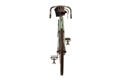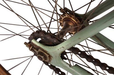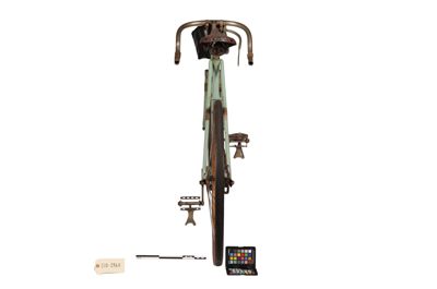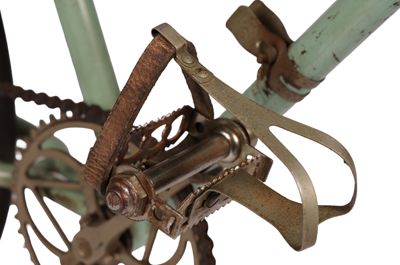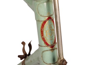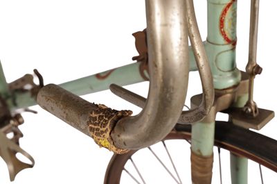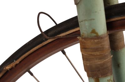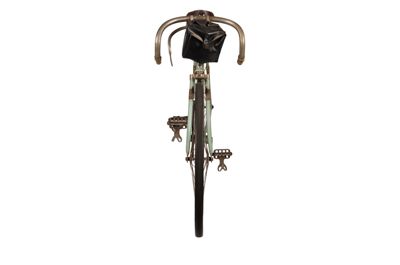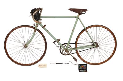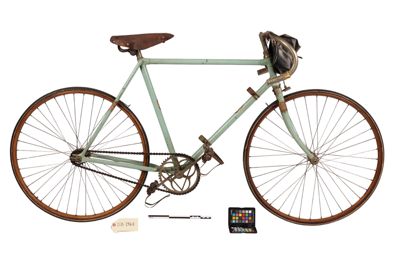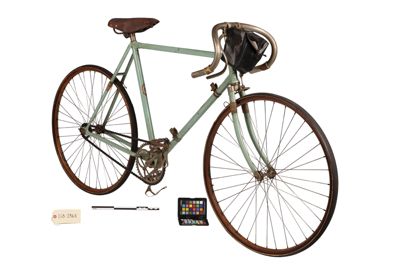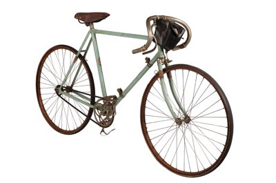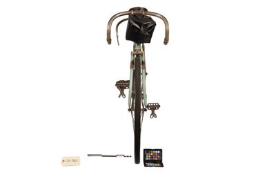 Bicicletta da corsa con telaio tubolare a trapezio e forcella in ferro, verniciato di colore celeste. Il manubrio a corna presenta le impugnature in gomma; parallela al braccio destro del manubrio, si trova la leva del freno a pattino sulla ruota anteriore, azionato a bacchetta. Davanti al manubrio è appeso un portaborracce in cuoio, dotato di due spazi. La bicicletta monta una sella in cuoio rigido. Il funzionamento si basa su una trasmissione a catena sulla ruota posteriore, tesa tra una una corona da 48 denti e un pignone da 18 denti; i pedali sono a gabbietta in metallo, con lacci in cuoio. La bicicletta poggia su ruote con cerchi in legno da 28", raggi tangenti in metallo e gomme pneumatiche; la ruota anteriore conta 36 raggi, mentre la ruota posteriore presenta 40 raggi.